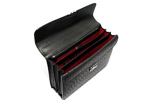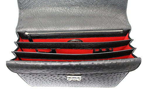 Описание товара: Классический мужской портфель ручной работы от миланской мануфактуры «Alfredo Beretta» из 100% кожи страуса высочайшего качества выделки. Портфель застёгивается на кодовый замок. Детали и декоративные элементы портфеля изготовлены из стали, покрытой палладием. Внутренняя часть портфеля изготовлена из телячьей кожи красного цвета, и имеет три больших отделения для переноски документов и прочих вещей, потайные отделения для переноски планшетных компьютеров типа iPad или компактных ноутбуков, хранения ценных бумаг или особо важных документов, одно дополнительное отделение, застёгивающееся на молнию с бегунком, и кармашки для хранения 3 ручек, смартфона, визитных карточек.