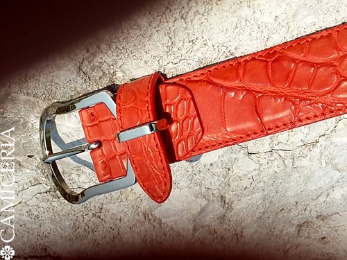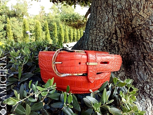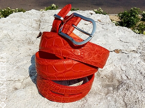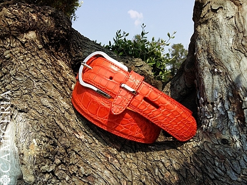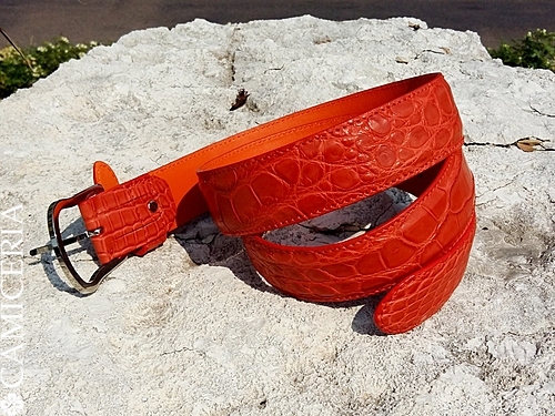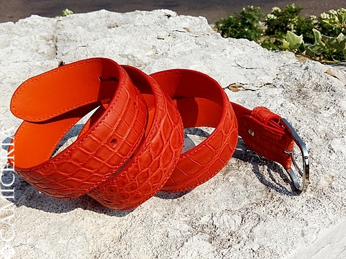Описание товара: Элегантный мужской ремень ручной работы «Brianza», изготовлен из 100% кожи нильского крокодила высочайшего качества выделки с матовой поверхностью. Ремень окрашен вручную в редкий, «апельсиновый оранжевый» цвет. Прямоугольная пряжка запатентованной конструкции изготовлена из никеля, покрытого палладием (PALLADIO). Крепление пряжки ремня на одном съемном болте, позволяет укорачивать ремень до нужного размера. Толщина ремня составляет 4,0 см., что позволяет носить его как с брюками, так и с джинсами.