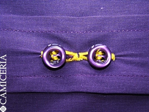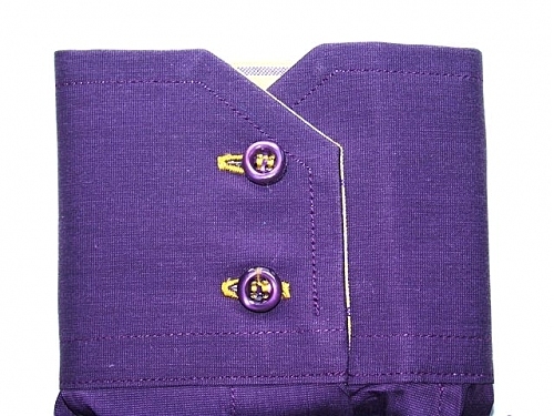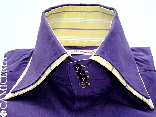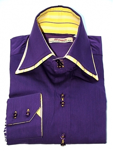 Описание товара: Элегантная мужская сорочка с двойным воротником на 4-х пуговицах и манжетами на 2-х пуговицах от итальянской марки "Camiceria Brianza". Сорочка имеет два воротника, внешний из которых выполнен из ткани аналогичной ткани сорочки, а внутренний изготовлен из ткани жёлтого цвета в фиолетово-белые полоски. Внутренняя часть манжет контрастная (выполнена из ткани жёлтого цвета в фиолетово-белые полоски, как и внутренний воротник). Сорочка застёгивается на сдвоенные пуговицы фиолетового цвета. Нагрудный карман отсутствует.