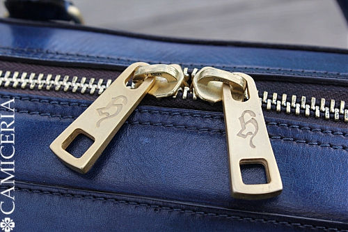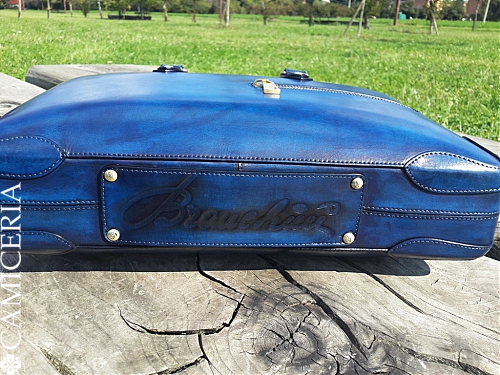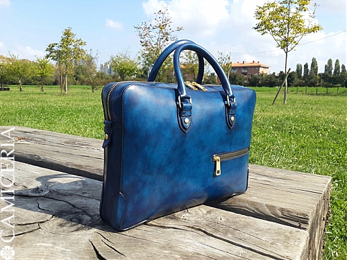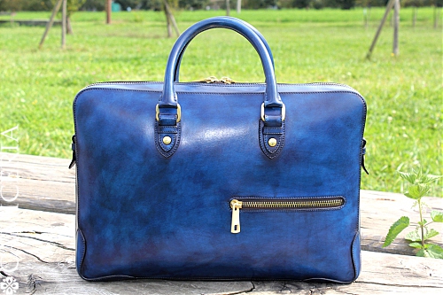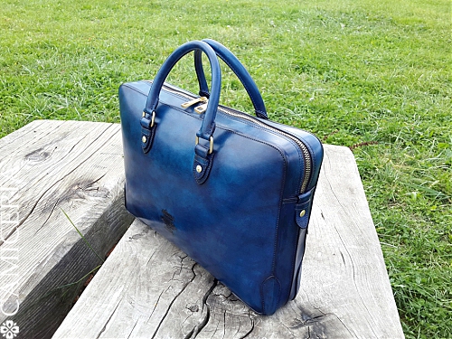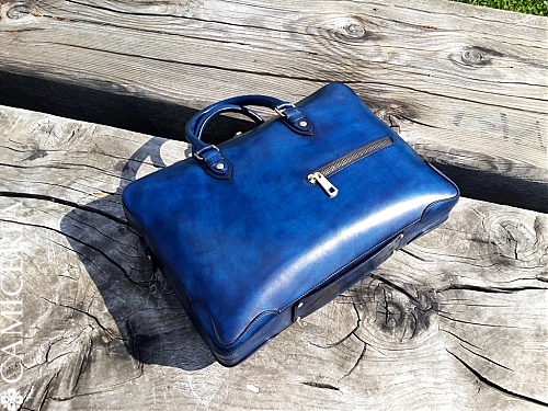 Описание товара: Элегантная мужская сумка–портфель ручной работы «Branchini» от легендарной болонской обувной мануфактуры «Branchini Calzoleria». Изготовлена из 100% кожи высочайшего качества выделки, окрашенной полностью вручную в насыщенный синий цвет («синий мрамор») с эффектом патинирования «антик». Детали и декоративные элементы сумки изготовлены из кожи тёмно–синего цвета и оружейной латуни (молнии, бегунки, заклепки). Сумка застегивается на молнии с фирменными бегунками с изображением логотипа марки в виде буквы «B», и имеет снаружи отделение для небольших документов. С обратной стороны сумка имеет тесненное изображение логотипа марки «Branchini Calzoleria» в виде герба. Внутренняя часть сумки изготовлена из кожи тёмно–бежевого цвета, и имеет одно большое отделение для переноски ноутбука, документов и прочих вещей, дополнительное отделение на молнии для хранения сотового телефона, бумажника, паспорта и прочих документов, и два дополнительных отделения.